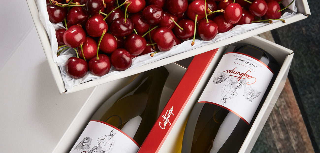 The exclusive Caythorpe Cherries & Wine Gift Box - 2kg of cherries and two bottles of wine of your choice packaged together in a single shipper box, has the ultimate WOW factor as a corporate gift.